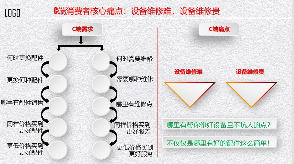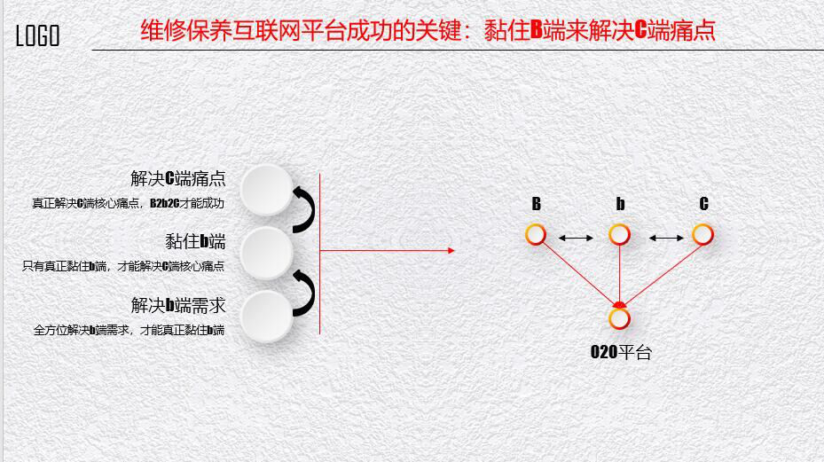 互聯(lián)網(wǎng)平臺怎樣才能夠有可能成功?就是必須拎住B(中間商)端,來解決C端的痛點(diǎn),互聯(lián)網(wǎng)平臺才能真正成功。知道真正的B端,才能解決C端的需求,全方位解決b端的需求,那才是B2B,也就是說粘住B端來解決C端痛點(diǎn)。C端的痛點(diǎn)是什么?第一是配件,第二是維修。每個維修企業(yè)的毛利率希望往上漲,同時希望我們的費(fèi)用率越來越低,將企業(yè)的毛利率和費(fèi)用率進(jìn)行疏導(dǎo),才能更好地獲得收益。