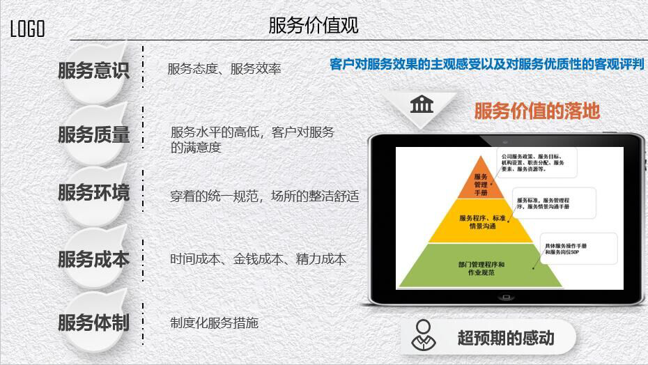 第一,理念是一種模式,技術(shù)服務(wù)型的企業(yè)是把企業(yè)文化定位為用戶為中心,圍繞用戶進(jìn)行發(fā)散和增值服務(wù)。服務(wù)理念是一個模型,整個團(tuán)隊(duì)首先要有一個同樣的理念,實(shí)現(xiàn)團(tuán)隊(duì)作戰(zhàn)。