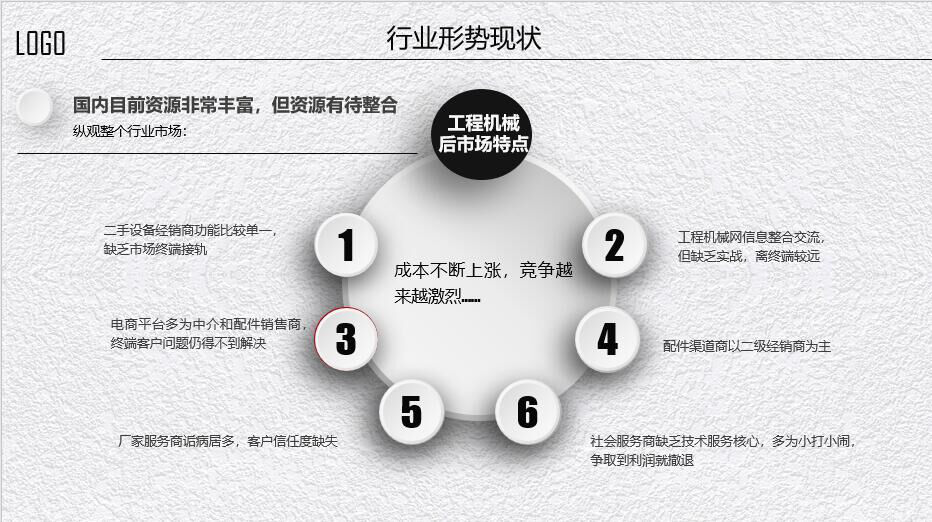 首先是現(xiàn)狀。國內(nèi)資源非常豐富,我們要將這些資源進(jìn)行整合。1)從二手設(shè)備經(jīng)銷商來說,現(xiàn)在的工人和終端客戶的交流相對較少,缺乏市場終端的機(jī)會,不懂客戶真正的需求。2)工程機(jī)械信息整合交流缺乏實(shí)戰(zhàn),離終端較遠(yuǎn)。3)電商平臺多為中介和配件經(jīng)銷商,終端客戶問題仍得不到解決。4)廠家服務(wù)商詬病多,客戶信任度缺失。5)配件渠道商及二級經(jīng)銷商為主。6)社會服務(wù)商缺乏技術(shù)核心,多為小打小鬧,掙錢了就撤退。