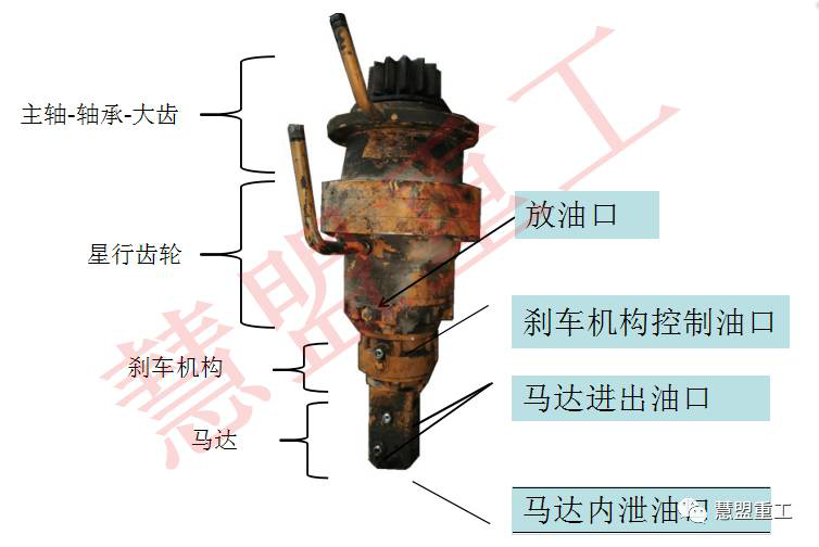 剎車機構(gòu)竄油到回轉(zhuǎn)減速機內(nèi),是很常見的情況 ,也是我們這次重點講解的對象,我們需要從回轉(zhuǎn)減速機上拆下剎車機構(gòu),并進行分解。