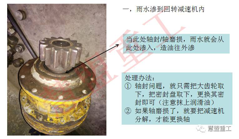 ②回轉(zhuǎn)減速機馬達軸封老化或損壞,軸磨損,馬達的液壓油竄到減速機內(nèi)。